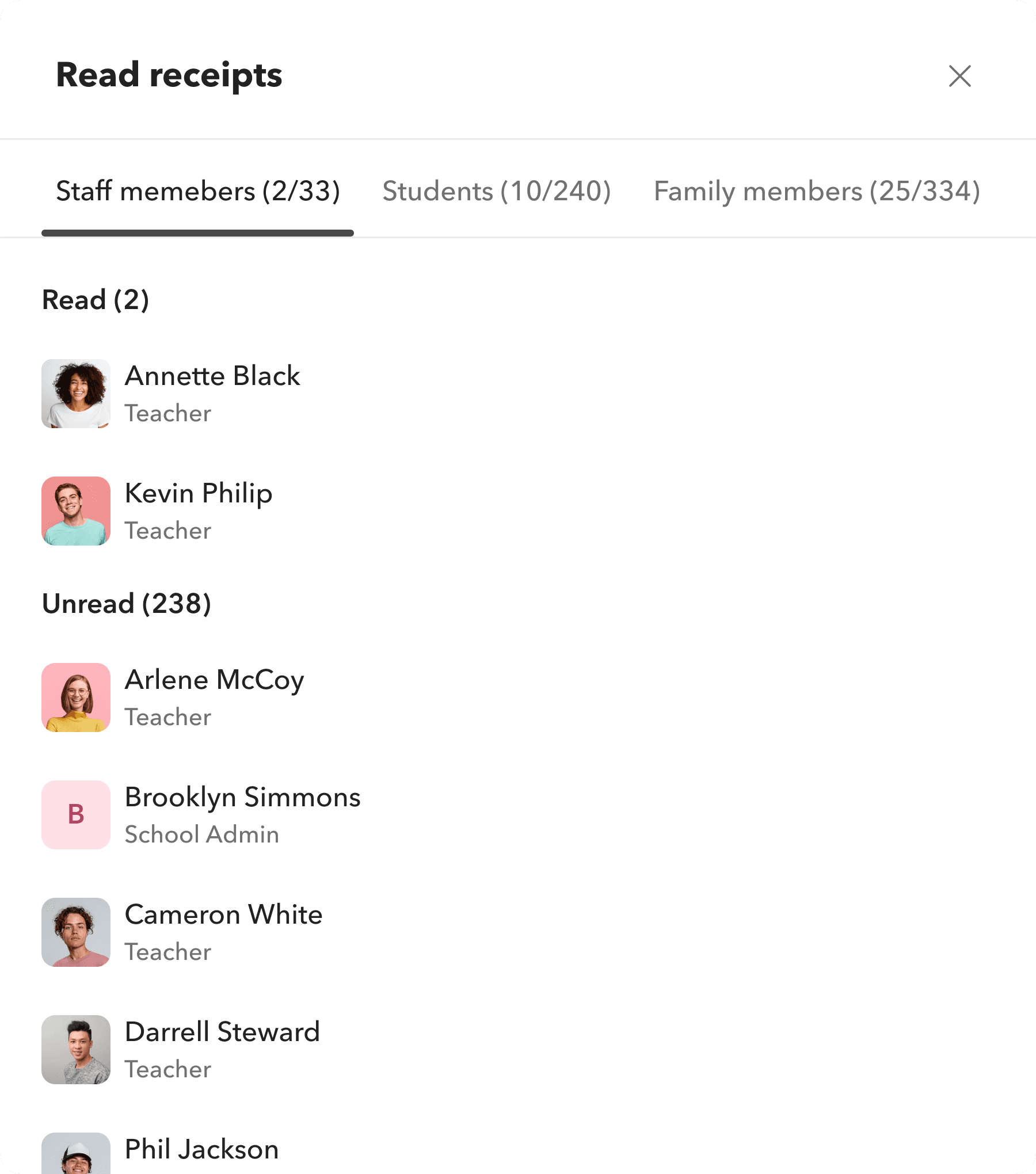 Teachers couldn’t message students or other staff; only parents. Admins had no direct way to broadcast updates to staff. Communication between different stakeholder types was fundamentally siloed.
