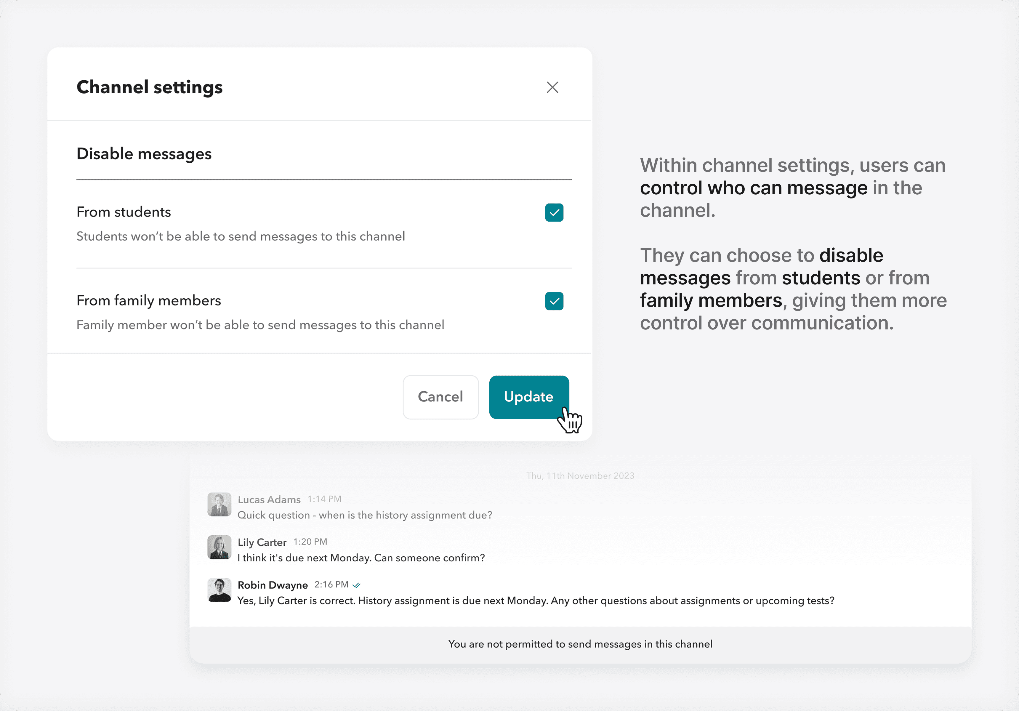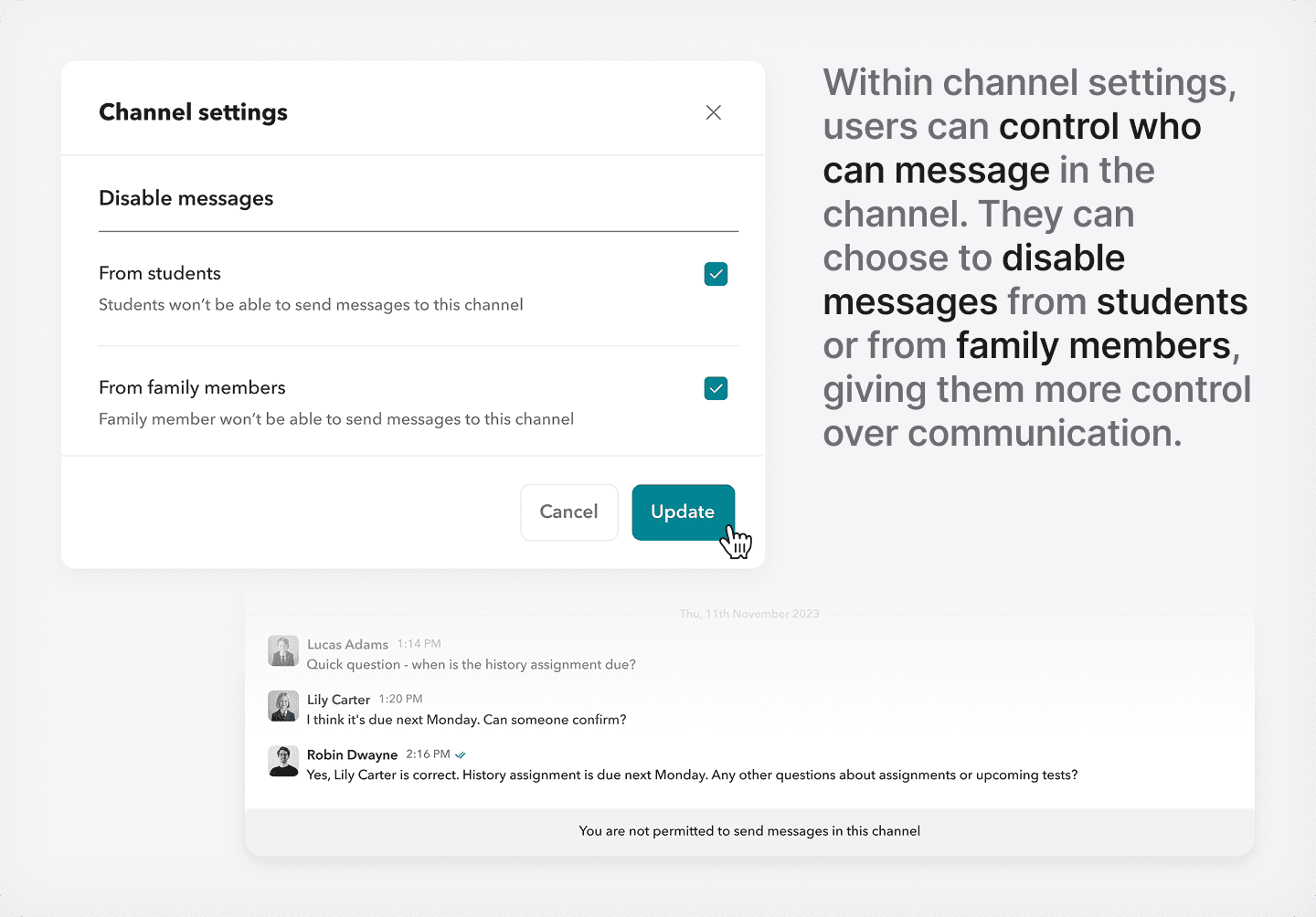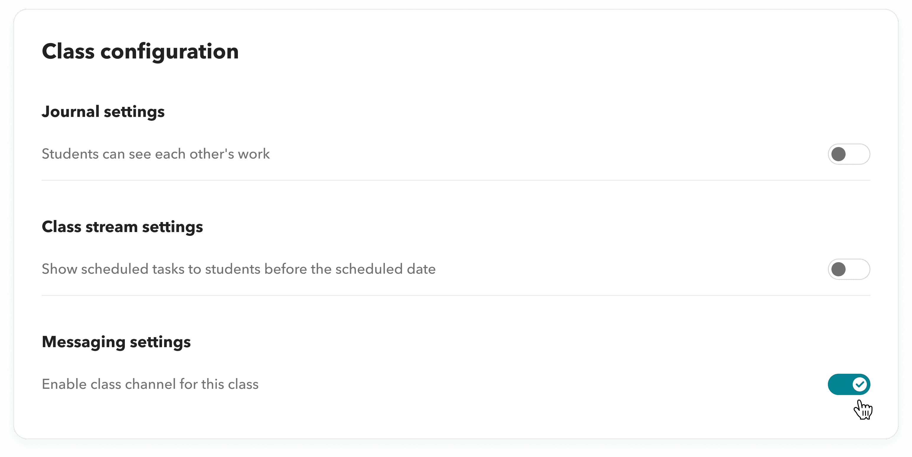 So we added a small but important setting. Inside the Class section (not the messaging module), teachers can now turn class channels on or off for each individual class. No disruption, no deletion just control. It’s a tiny toggle.