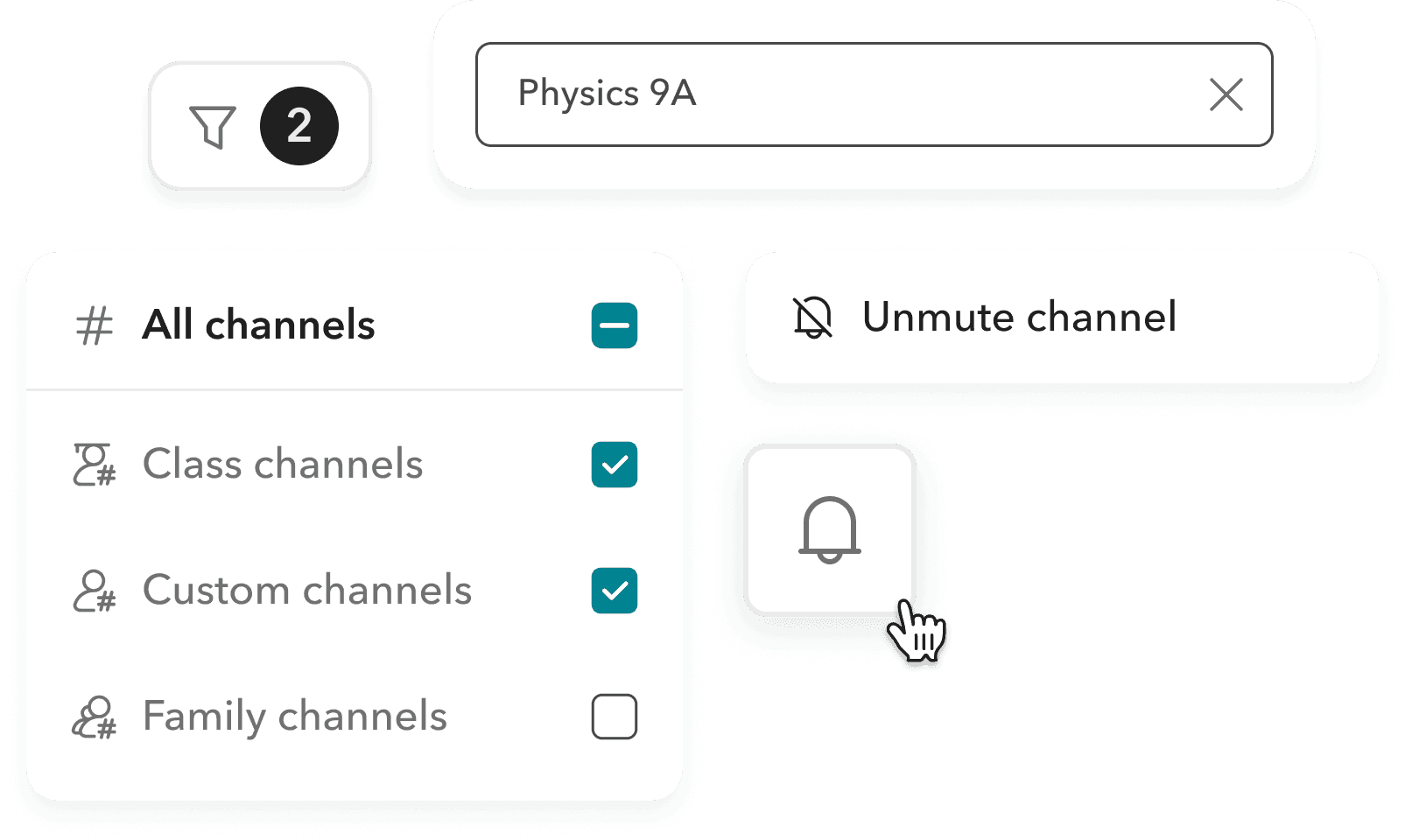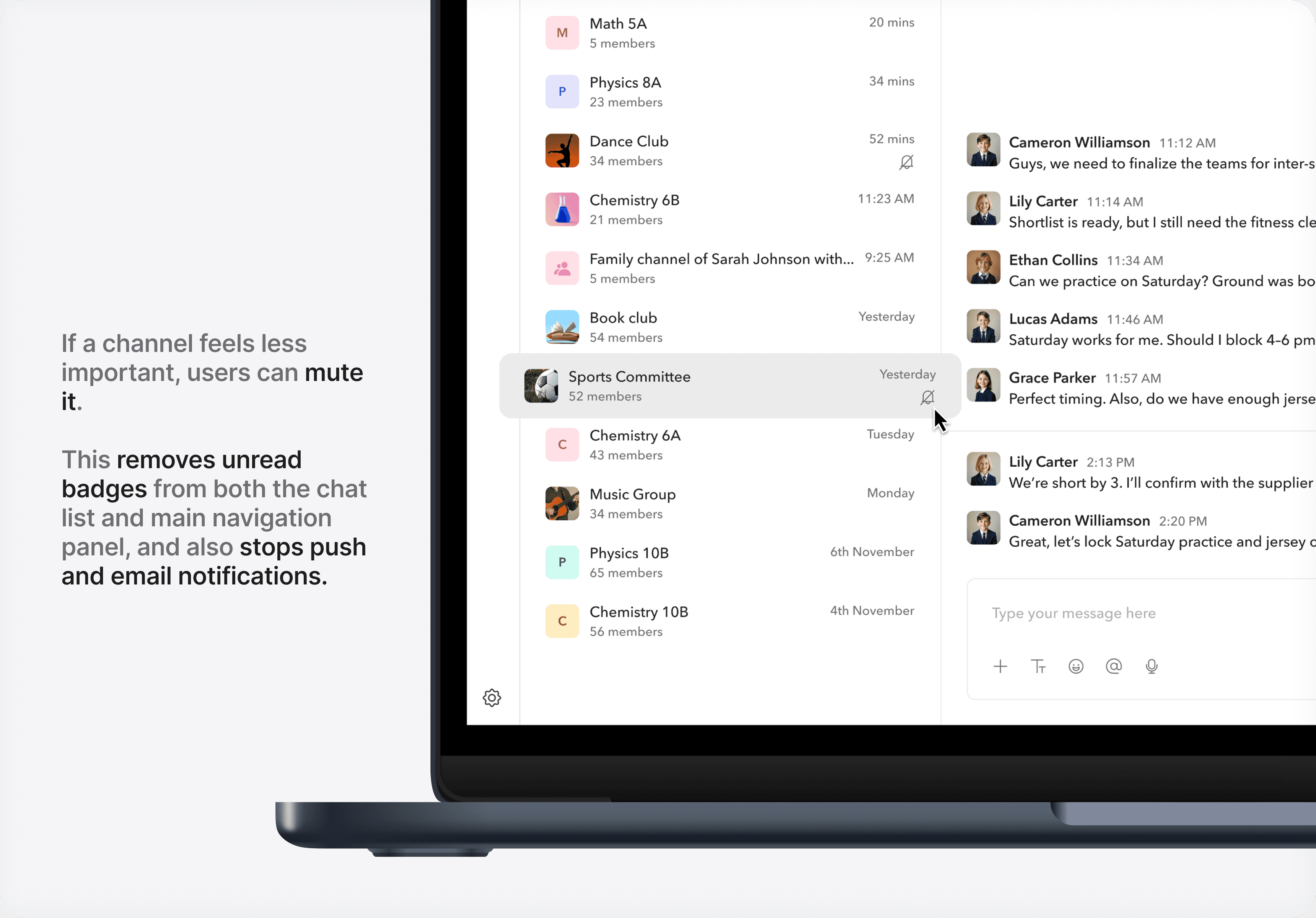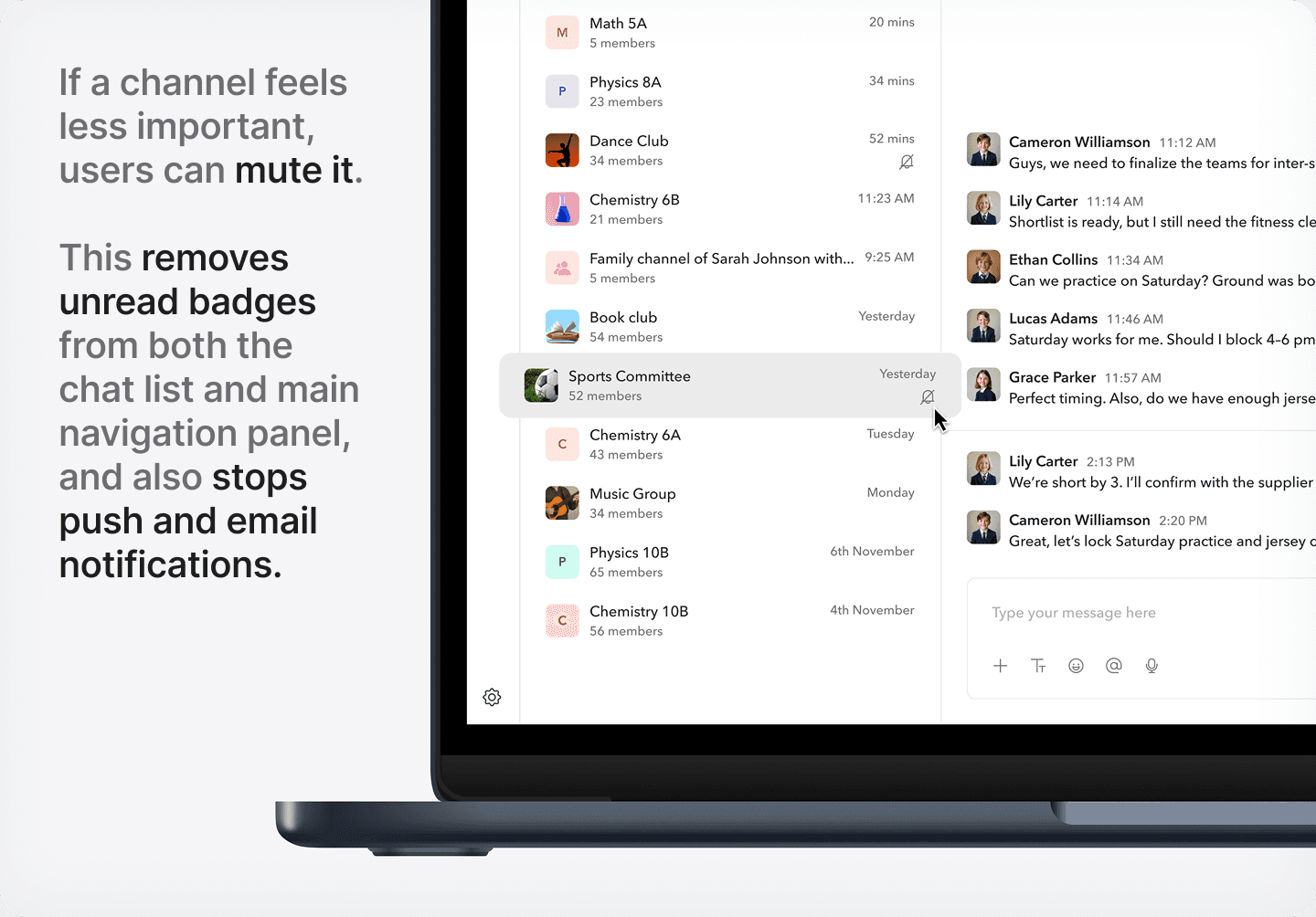 Similar to chats, users can search for channels and filter them by type. They can also mute or unmute channels anytime, giving them convenient control over how they engage.