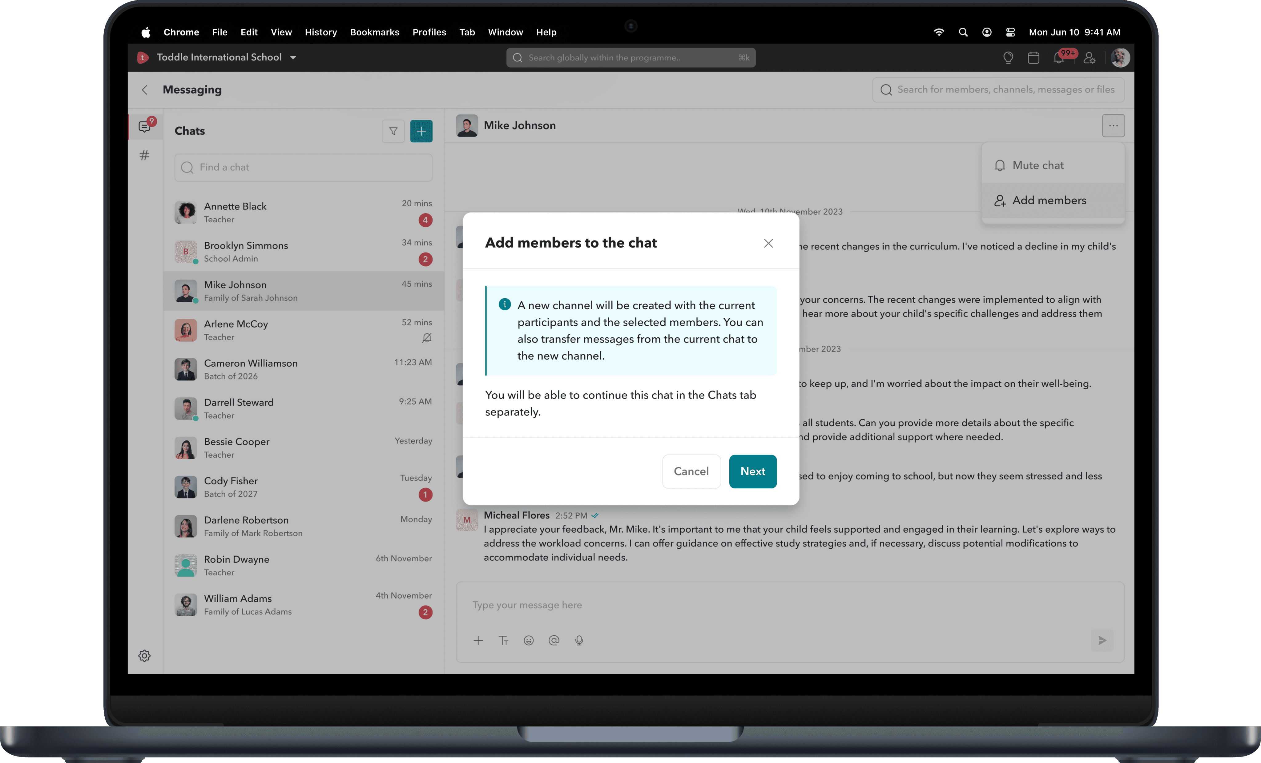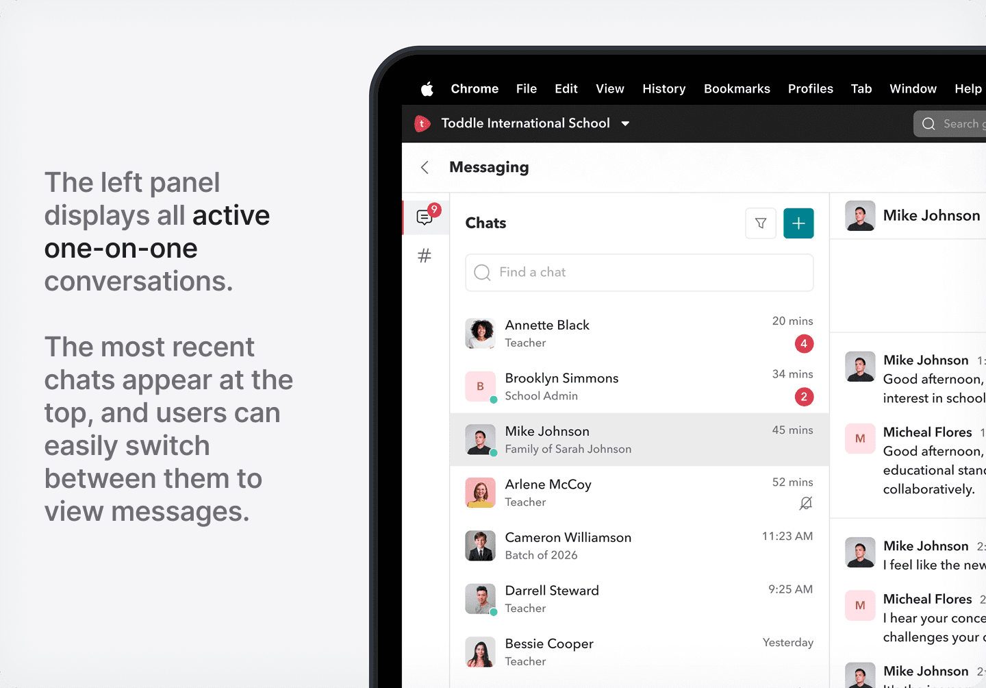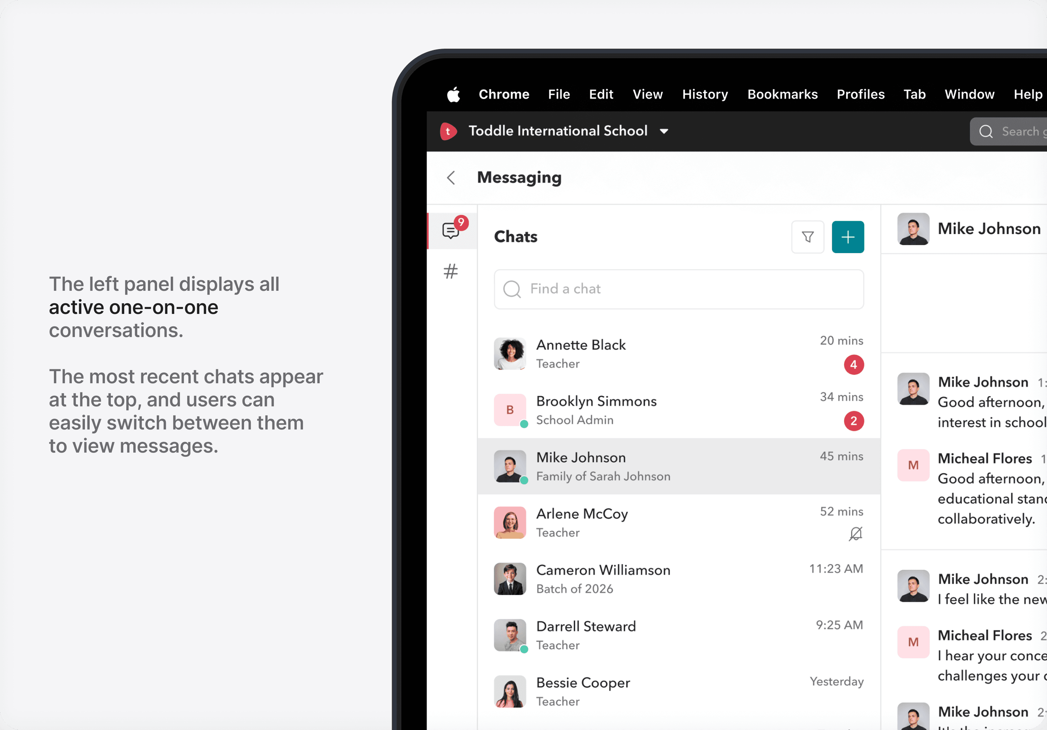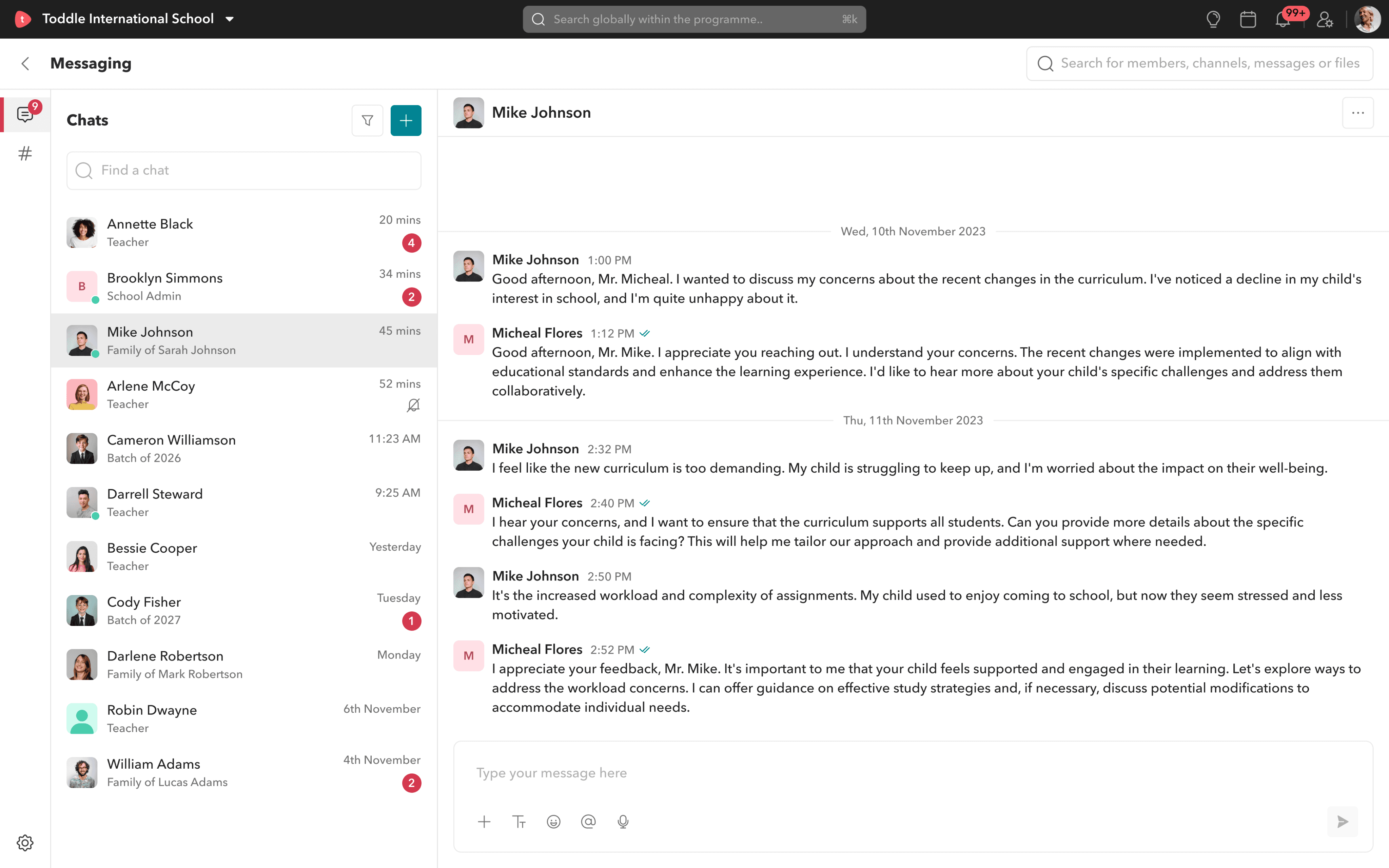 Chats are designed as one-to-one conversations. Teachers can message other teachers, students, and parents, while parents and students can only initiate conversations with teachers.
