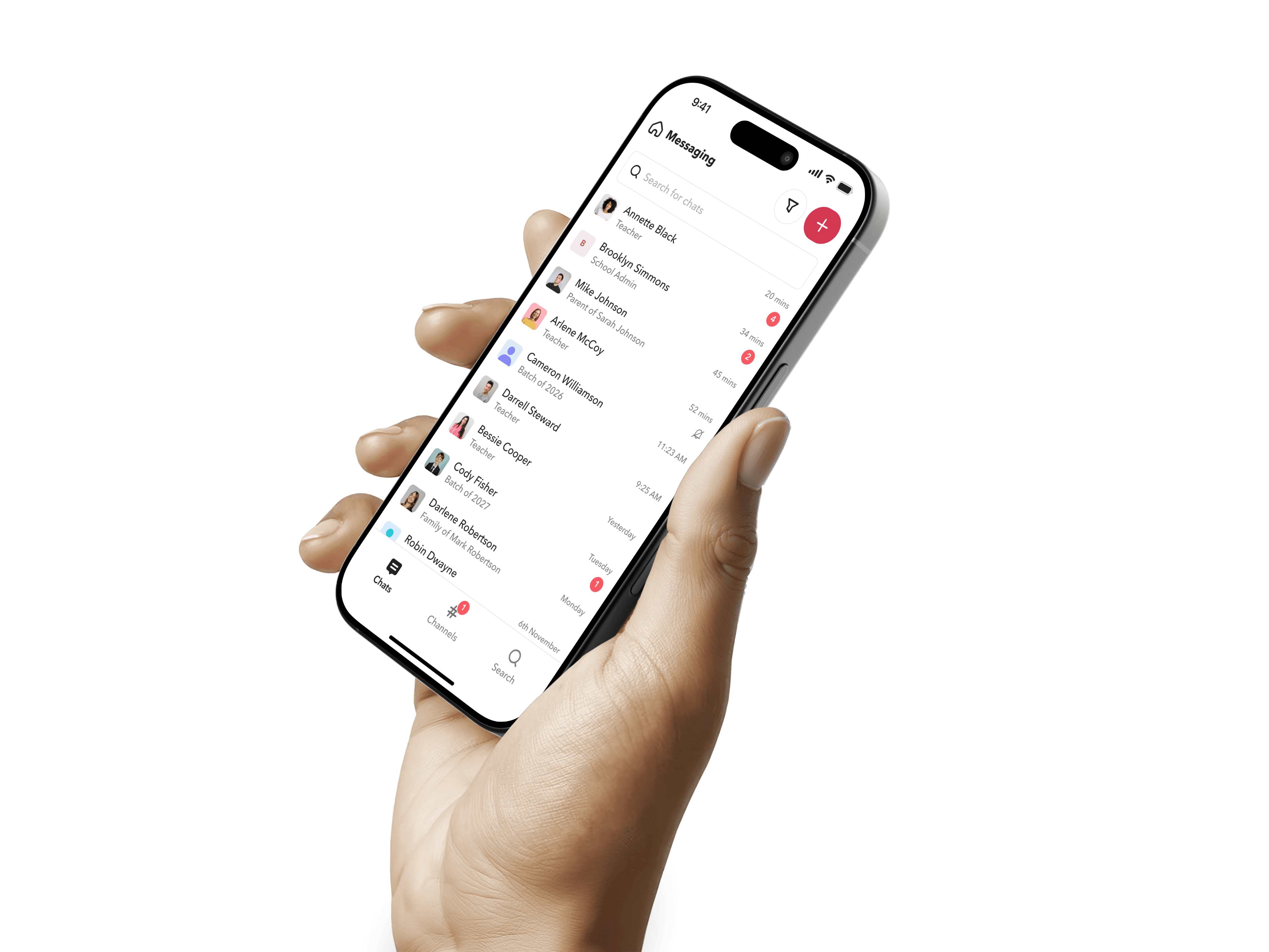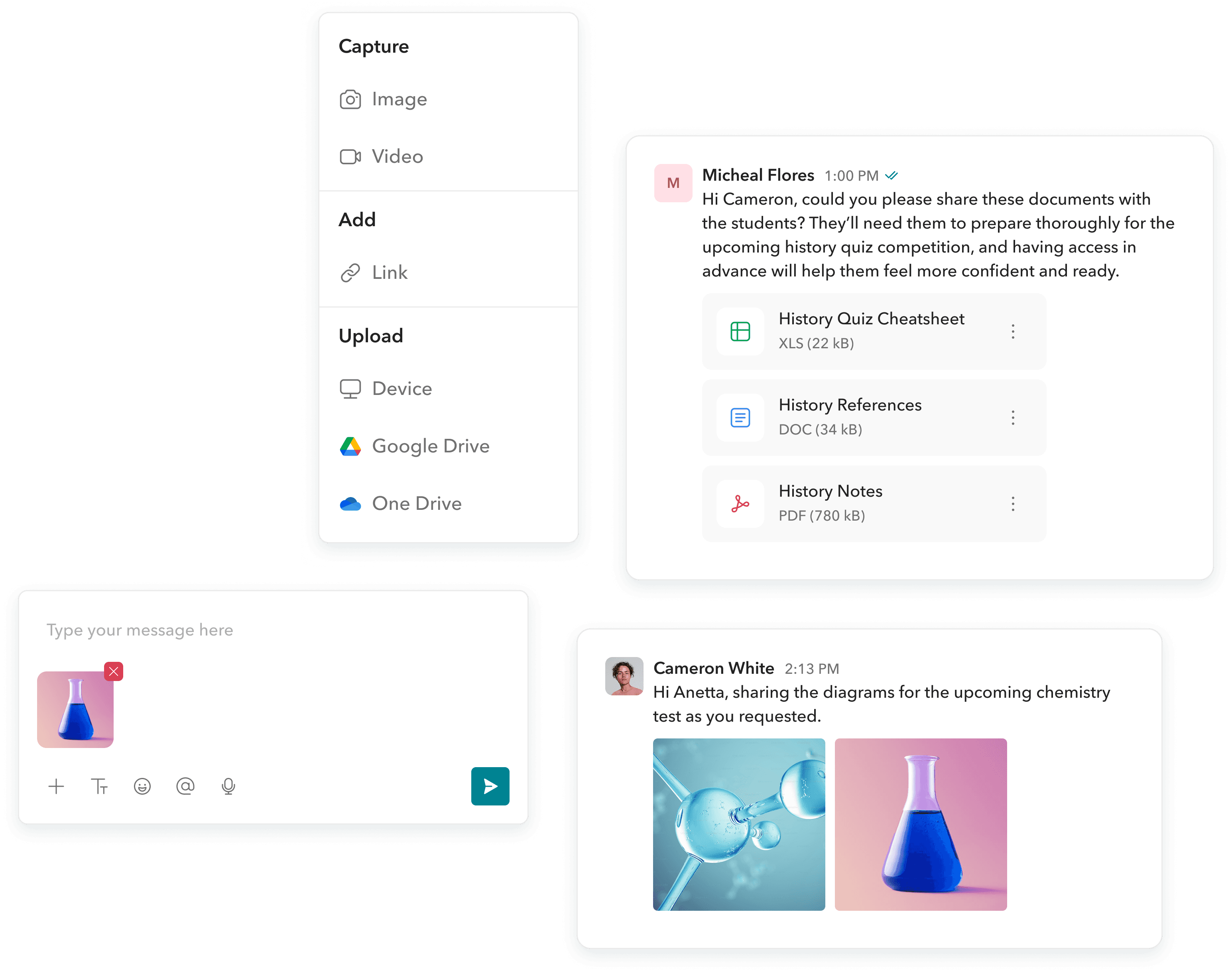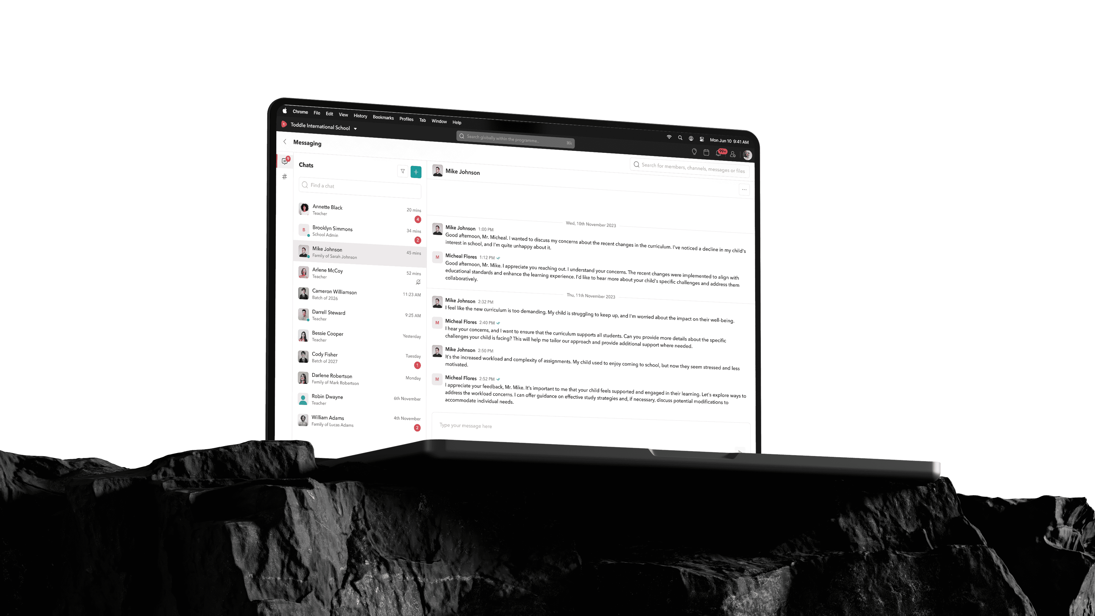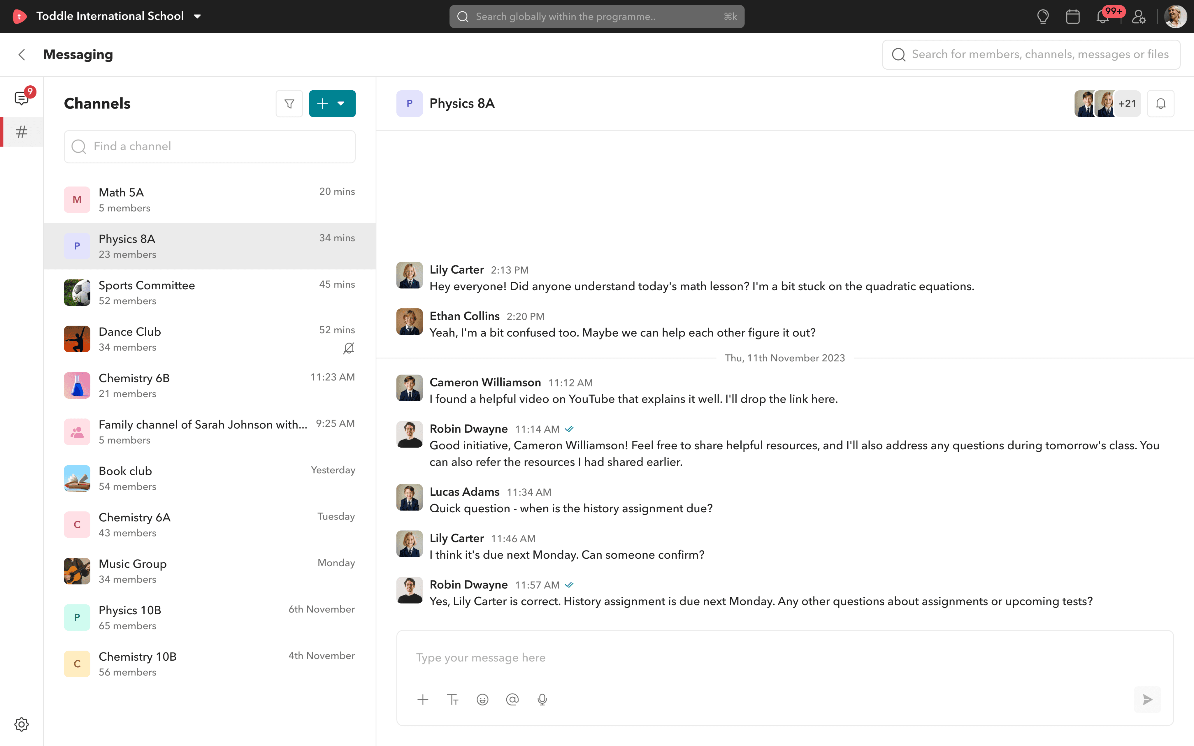 Chats are designed as one-to-one conversations. Teachers can message other teachers, students, and parents, while parents and students can only initiate conversations with teachers.