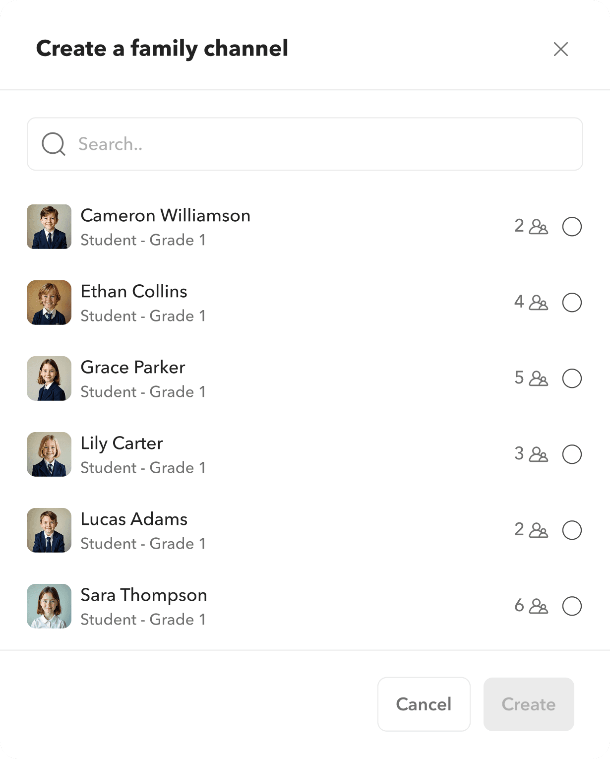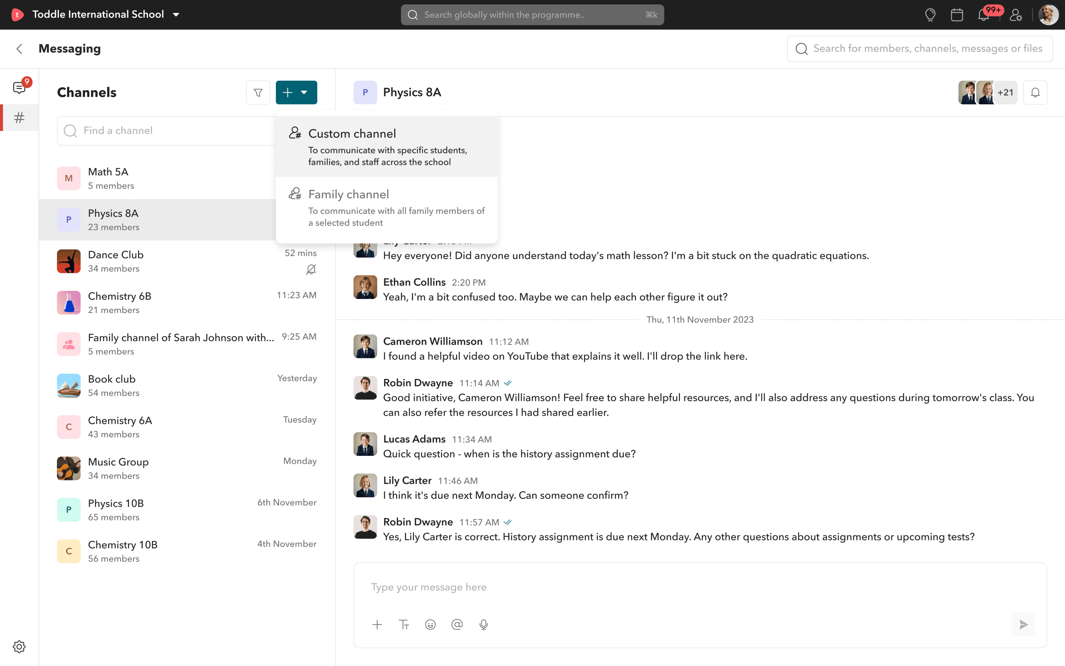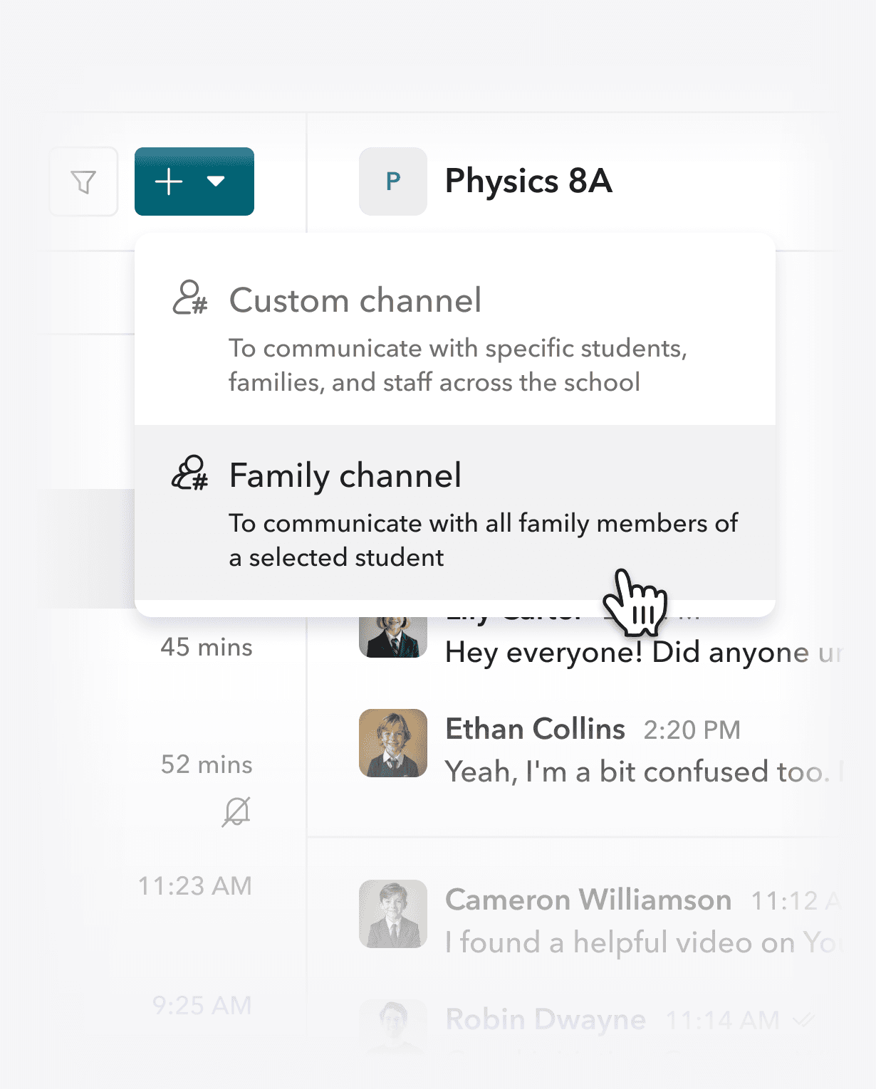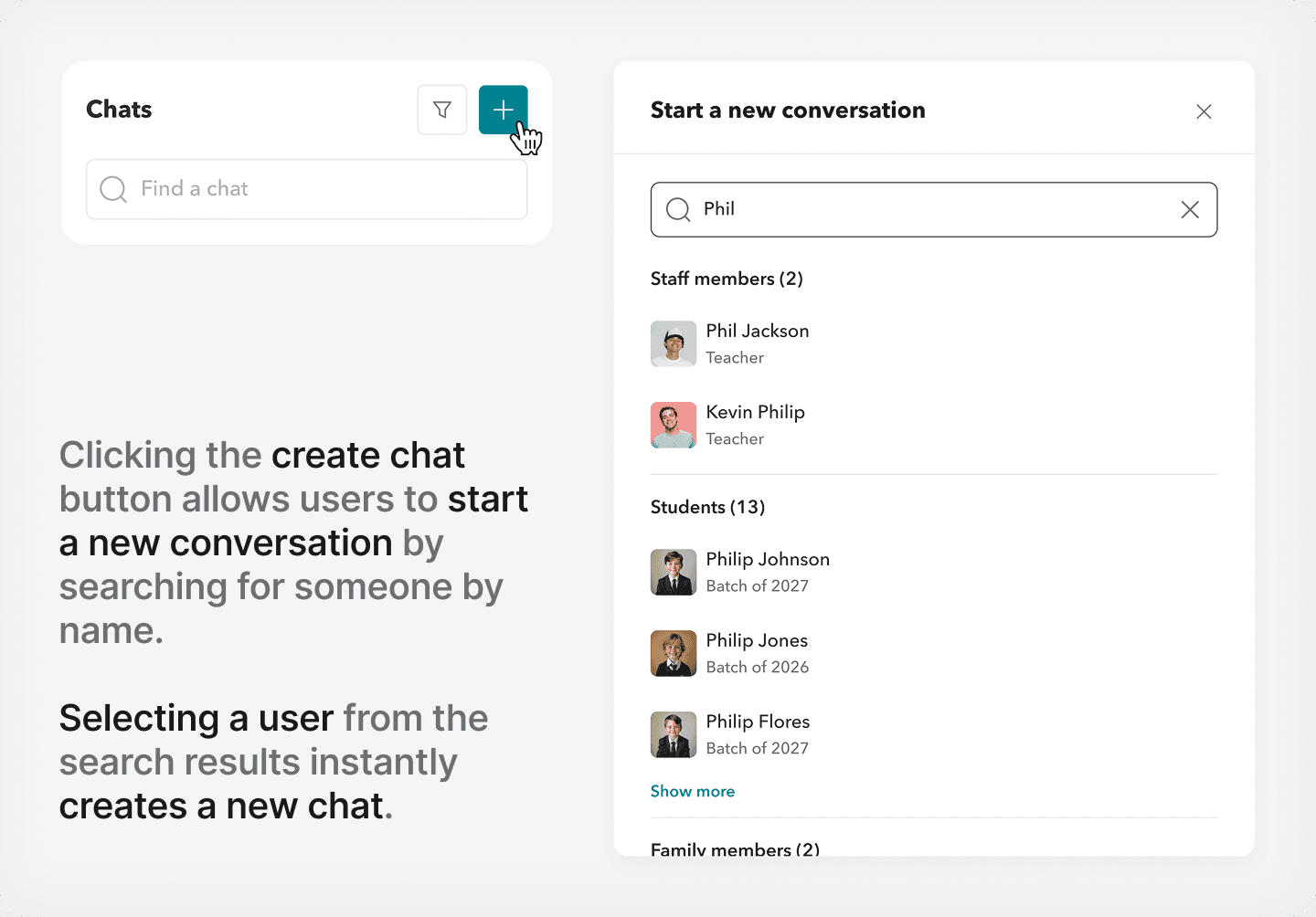 Hover over any user’s profile picture - be it student, parent, or staff - and start a message directly from there. For students, you even get a dropdown: message the student, their parents, or create a family channel.