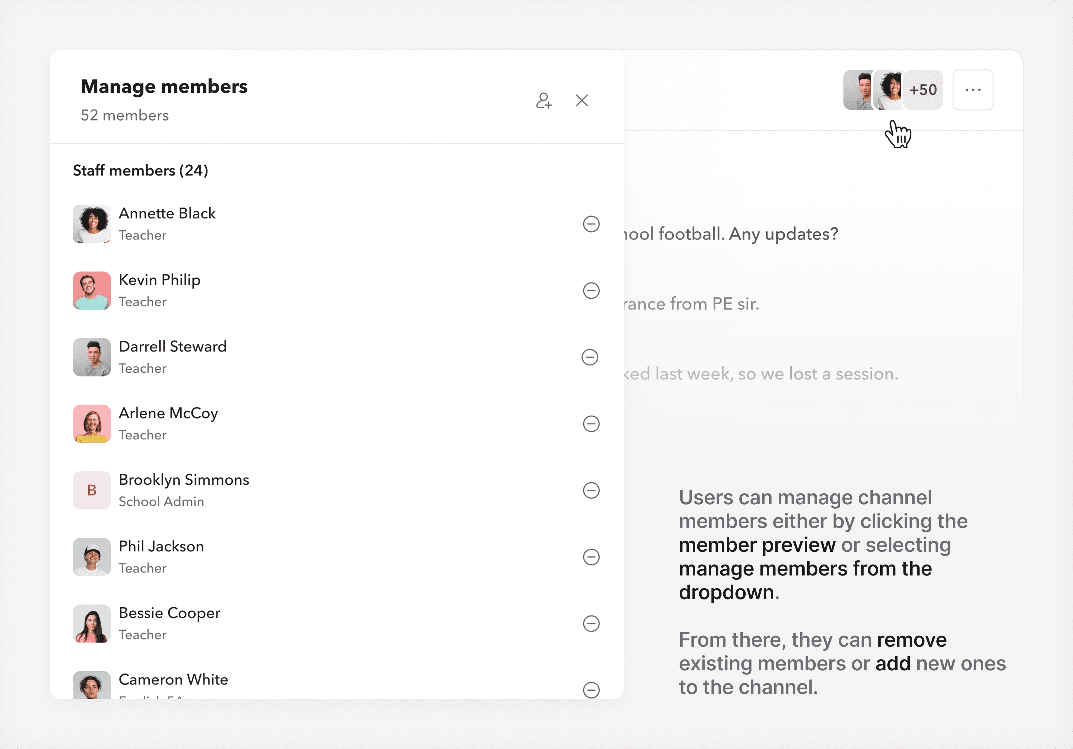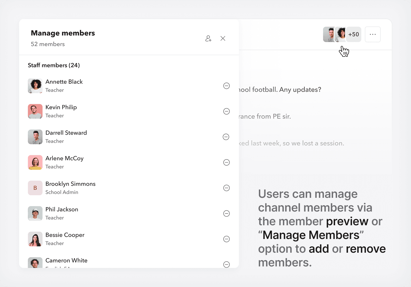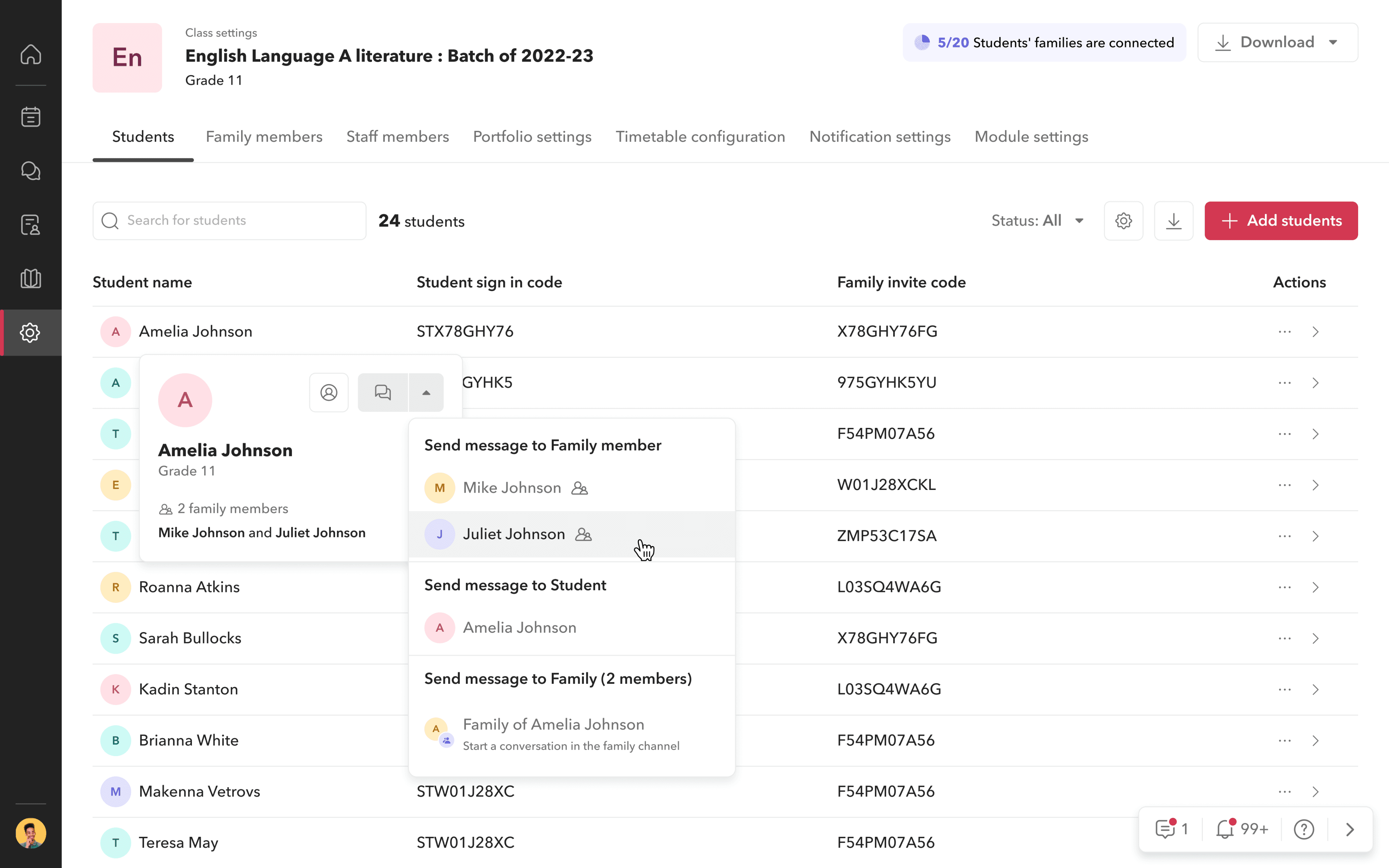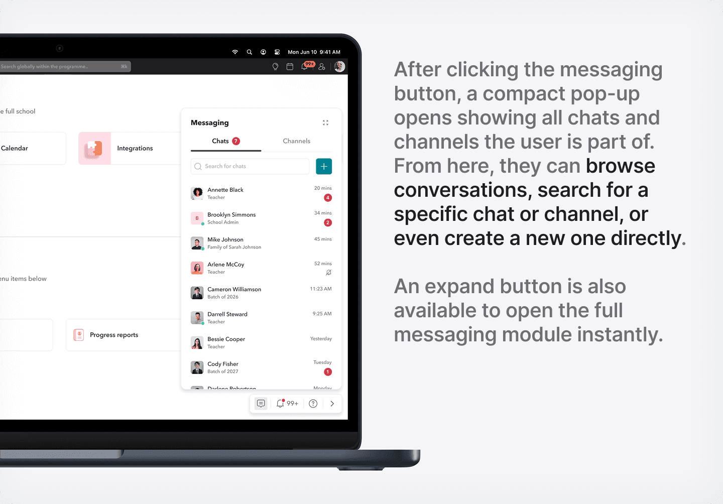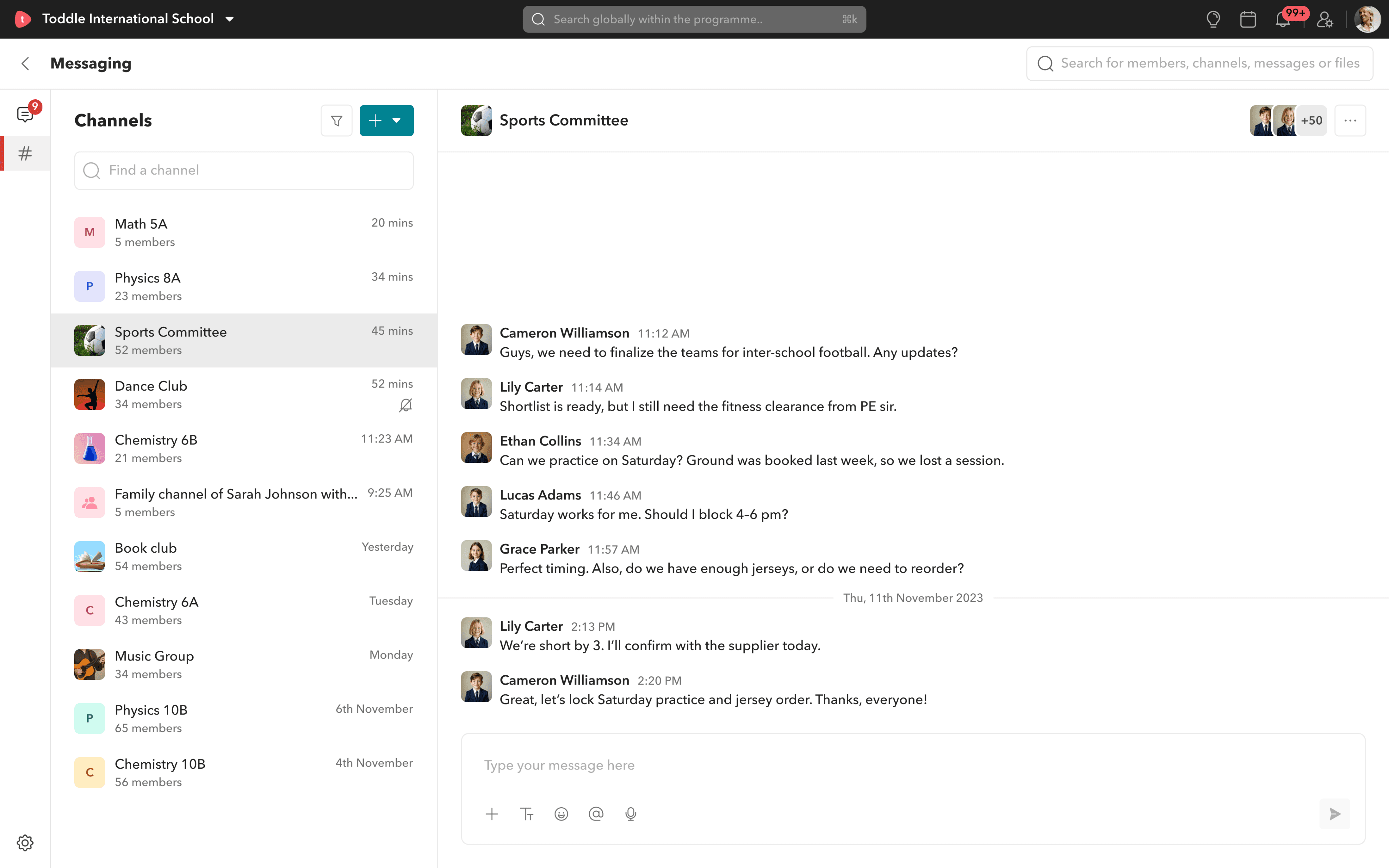 Hover over any user’s profile picture - be it student, parent, or staff - and start a message directly from there. For students, you even get a dropdown: message the student, their parents, or create a family channel.