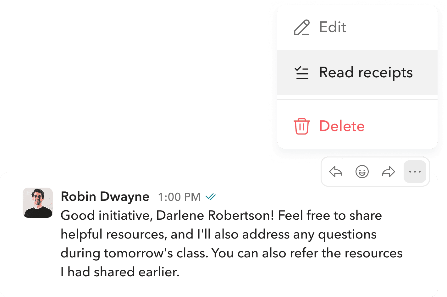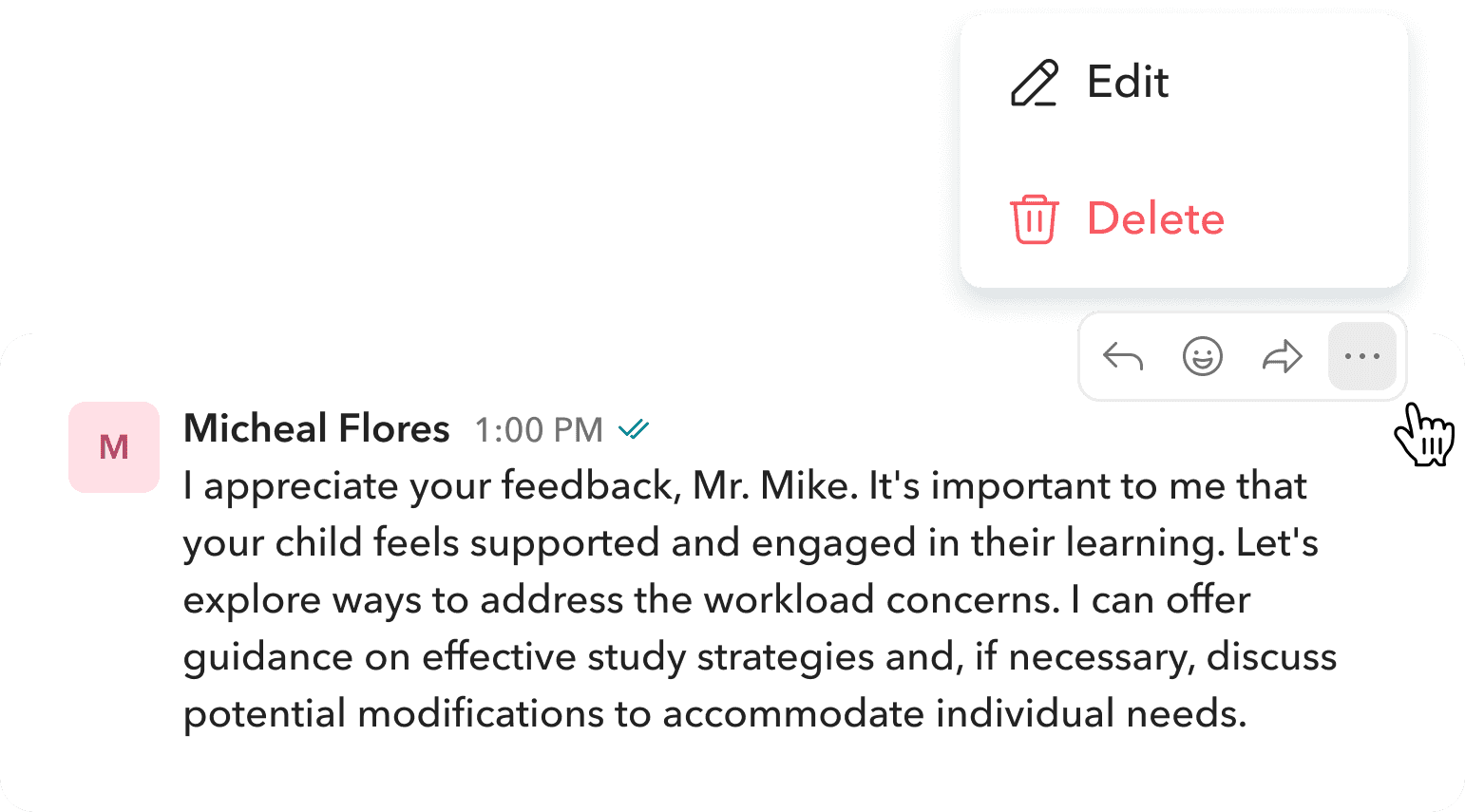 Users can edit or delete their own messages by hovering over them and selecting the three-dot menu. This gives them control to correct mistakes or remove messages when needed.