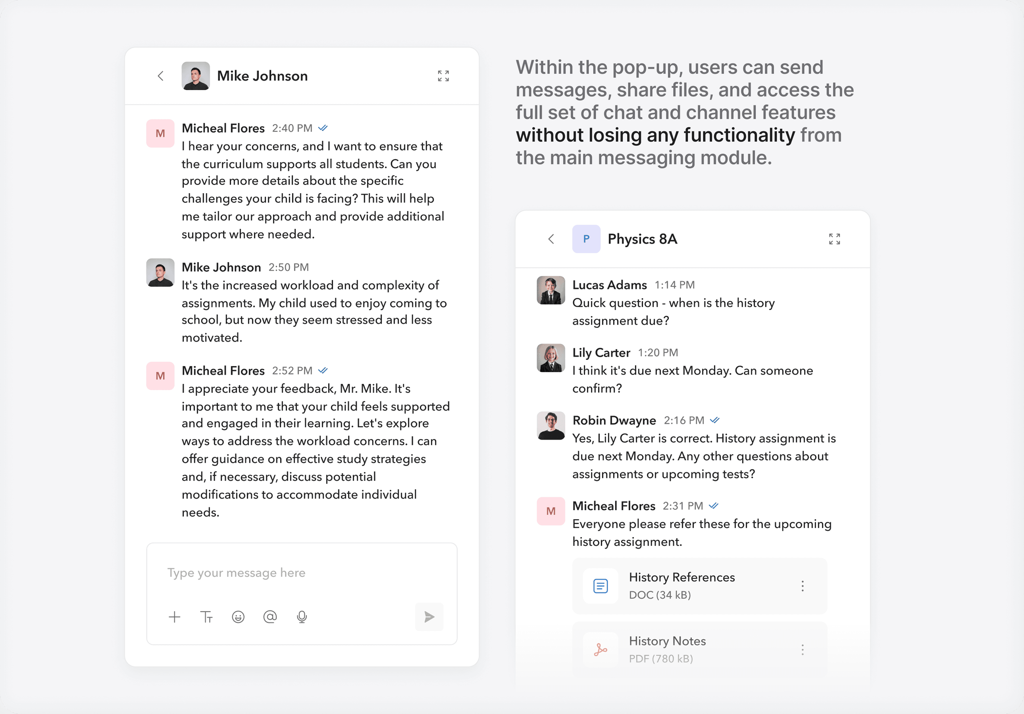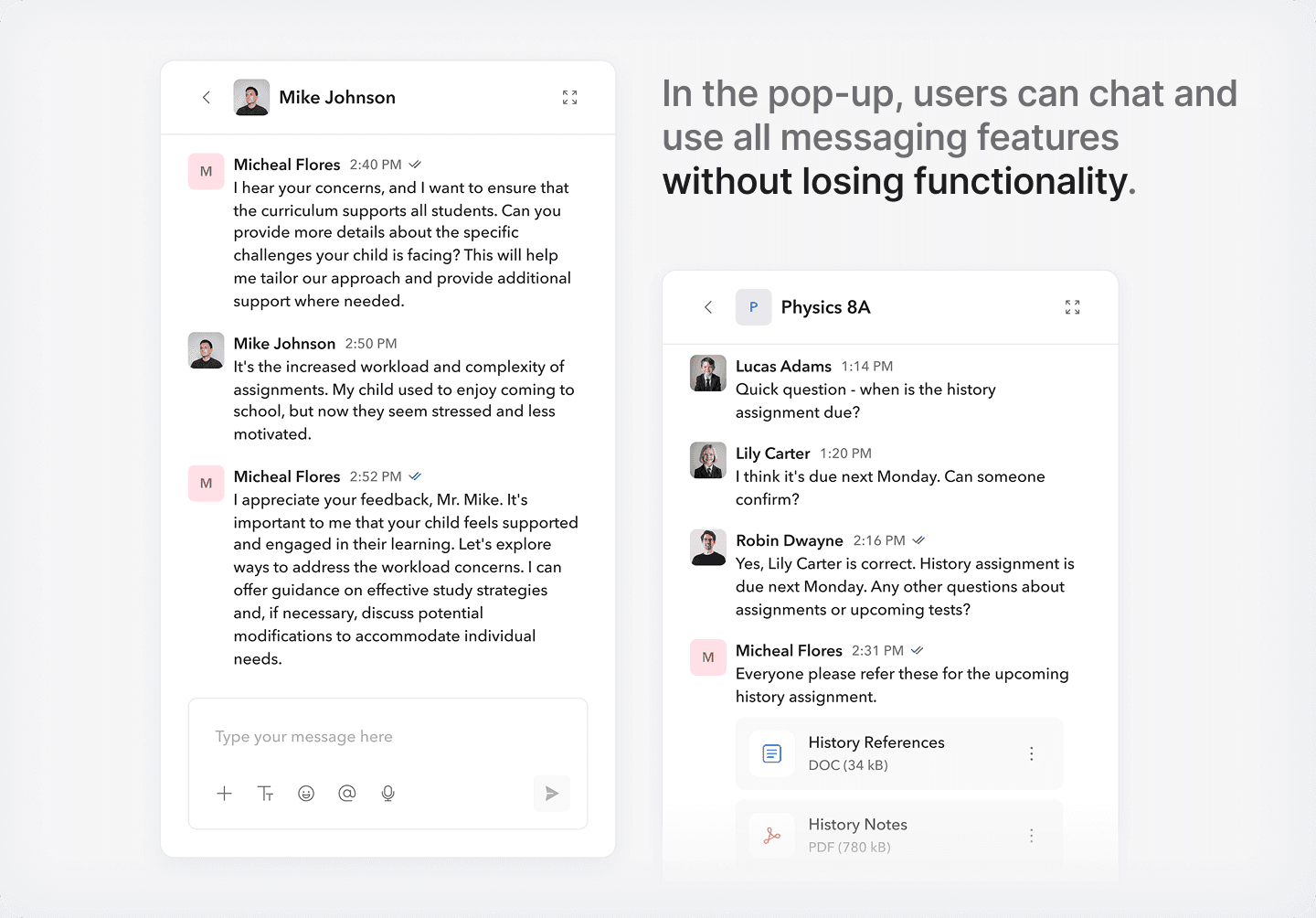 No way to message both parents of a student in one place. Teachers couldn’t loop others into an ongoing thread. Conversations often started as 1-on-1 but needed to grow; and the system didn’t support that.