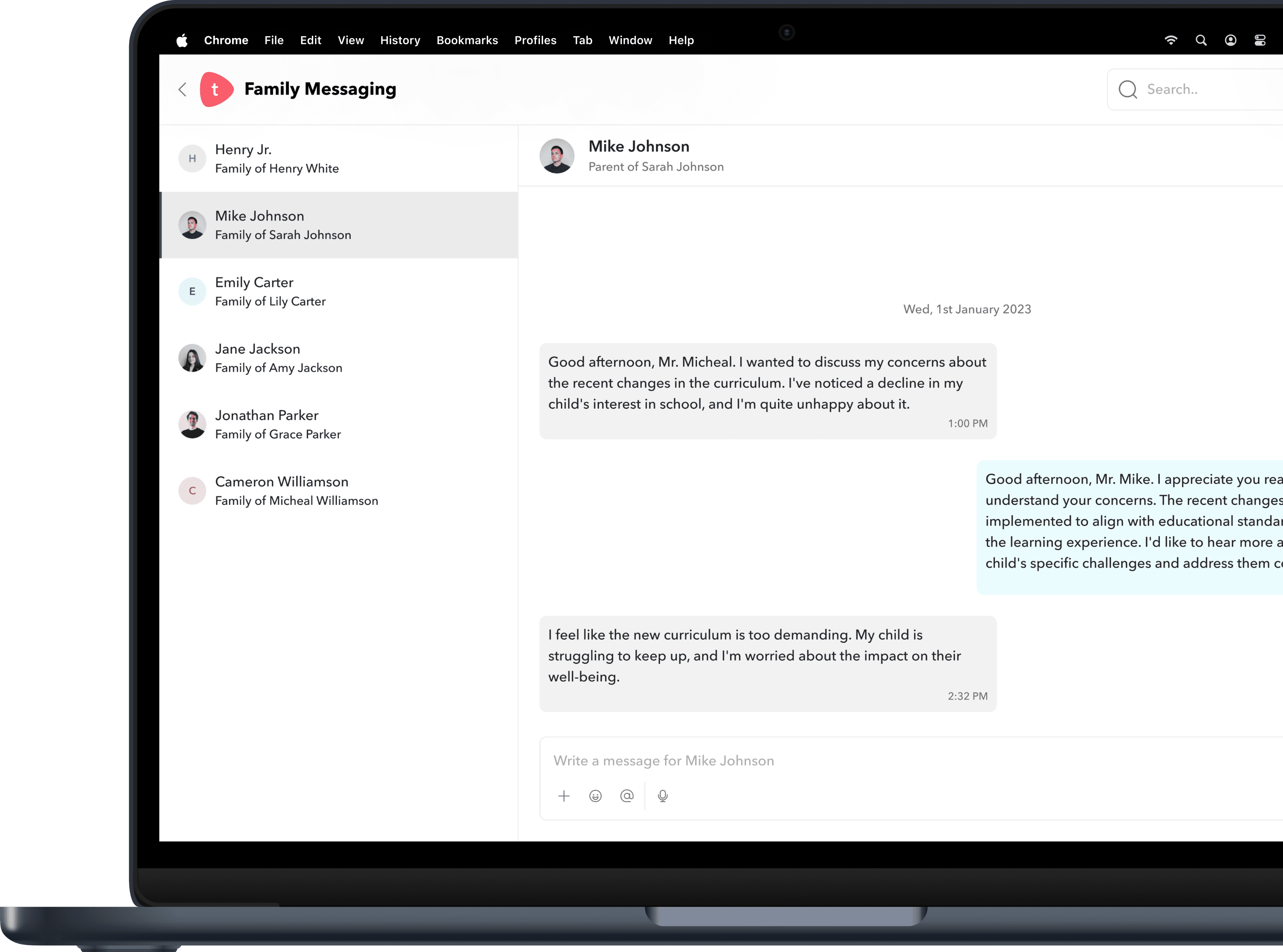 The existing “Family Messaging” feature only allowed teachers to chat with one parent at a time.